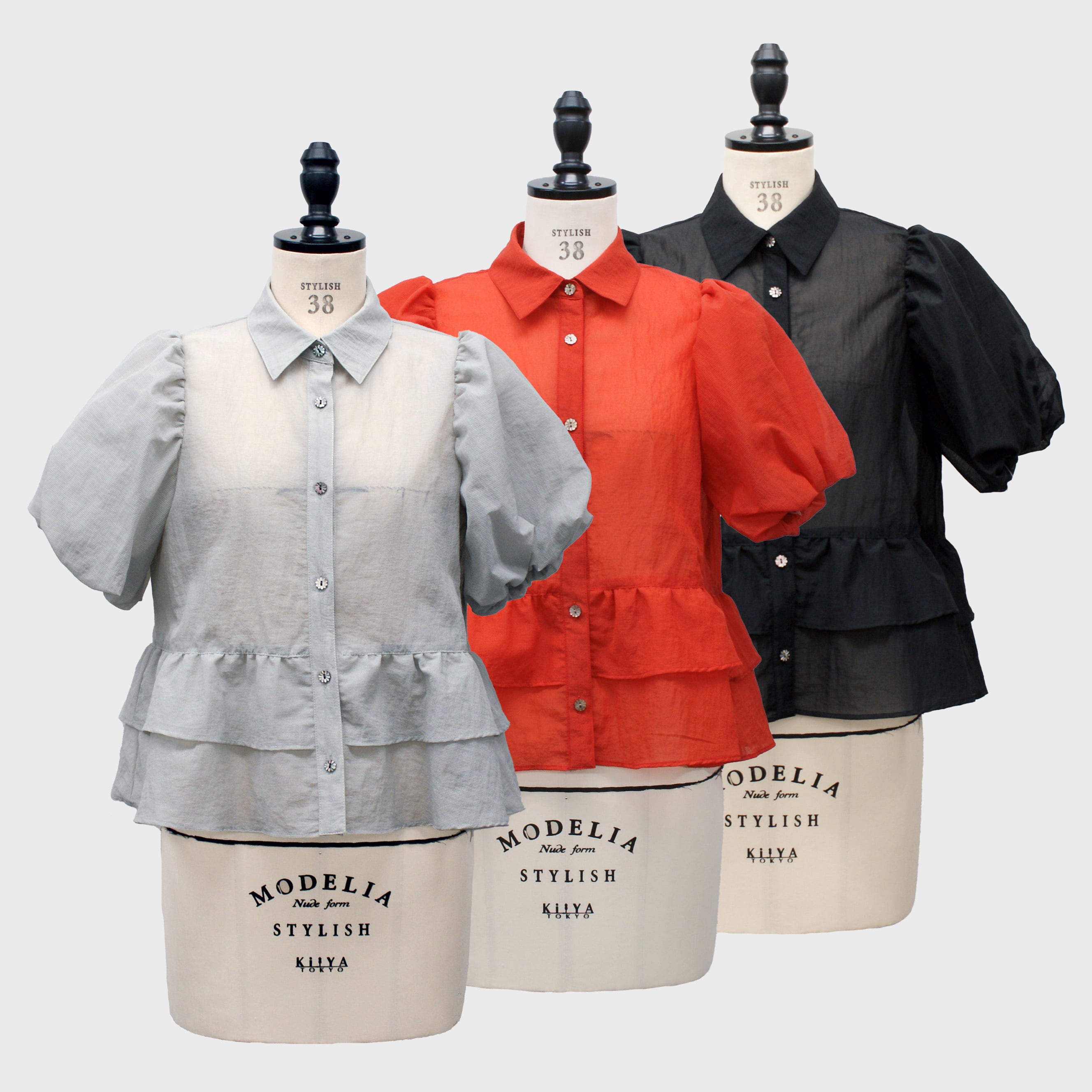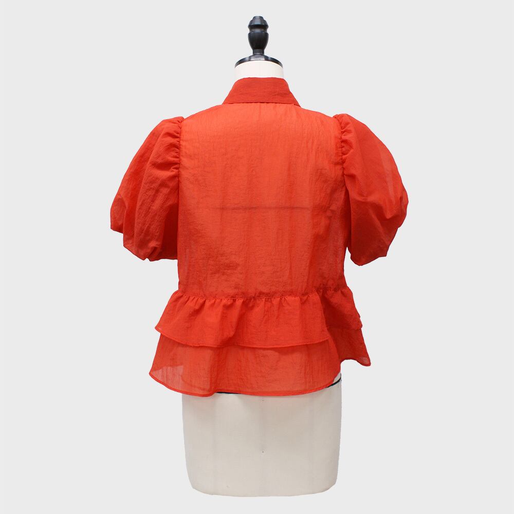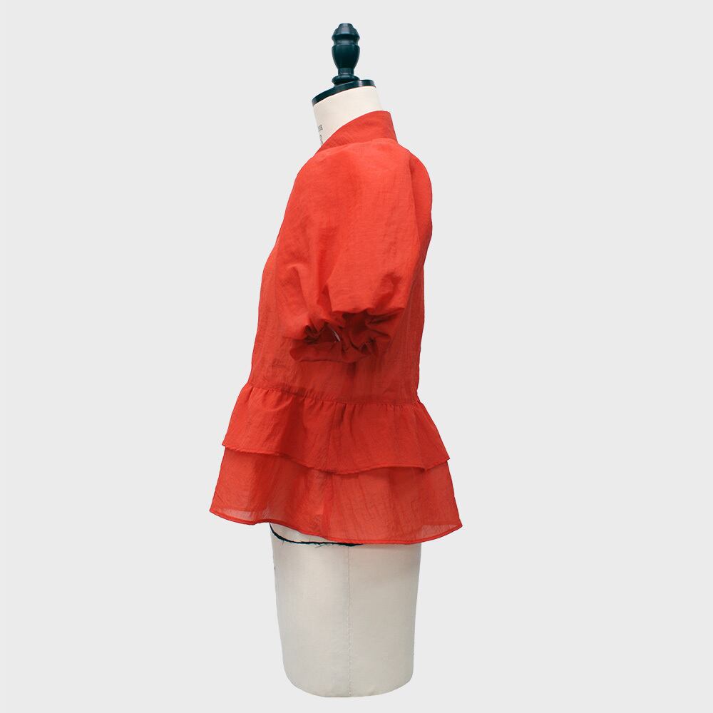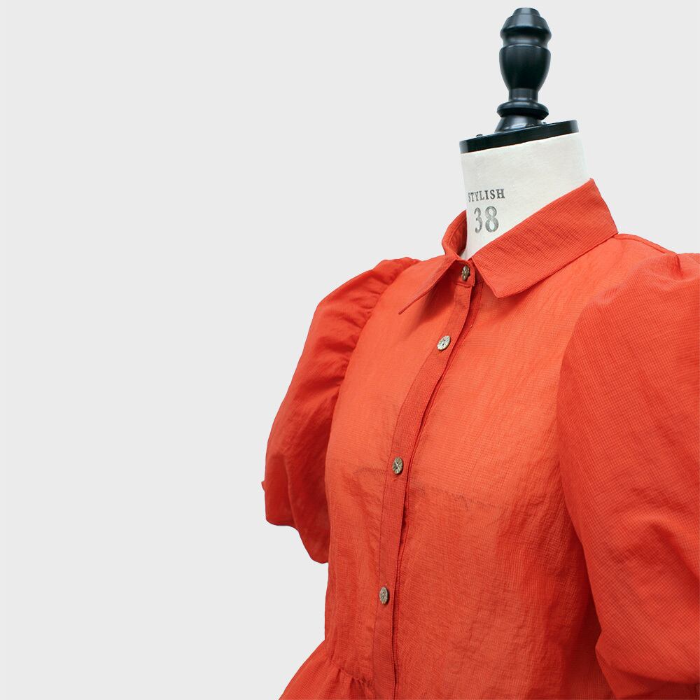 バルーンスリーブと2段のティアードペプラムが華やかなシャツブラウス。